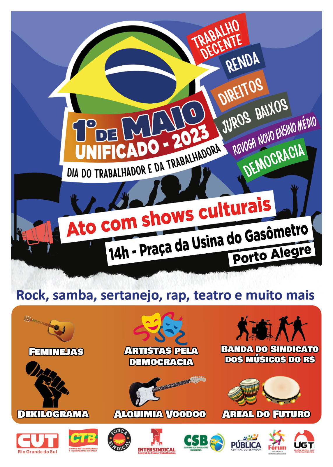 Haverá participação das Femenejas (um grupo de mulheres que canta sertanejo), o rap de Dekilograma, o rock de Alquimia Voodoo, o samba do Areal do Futuro e a banda do Sindicato dos Músicos do RS, bem como uma esquete teatral dos Artistas pela Democracia.