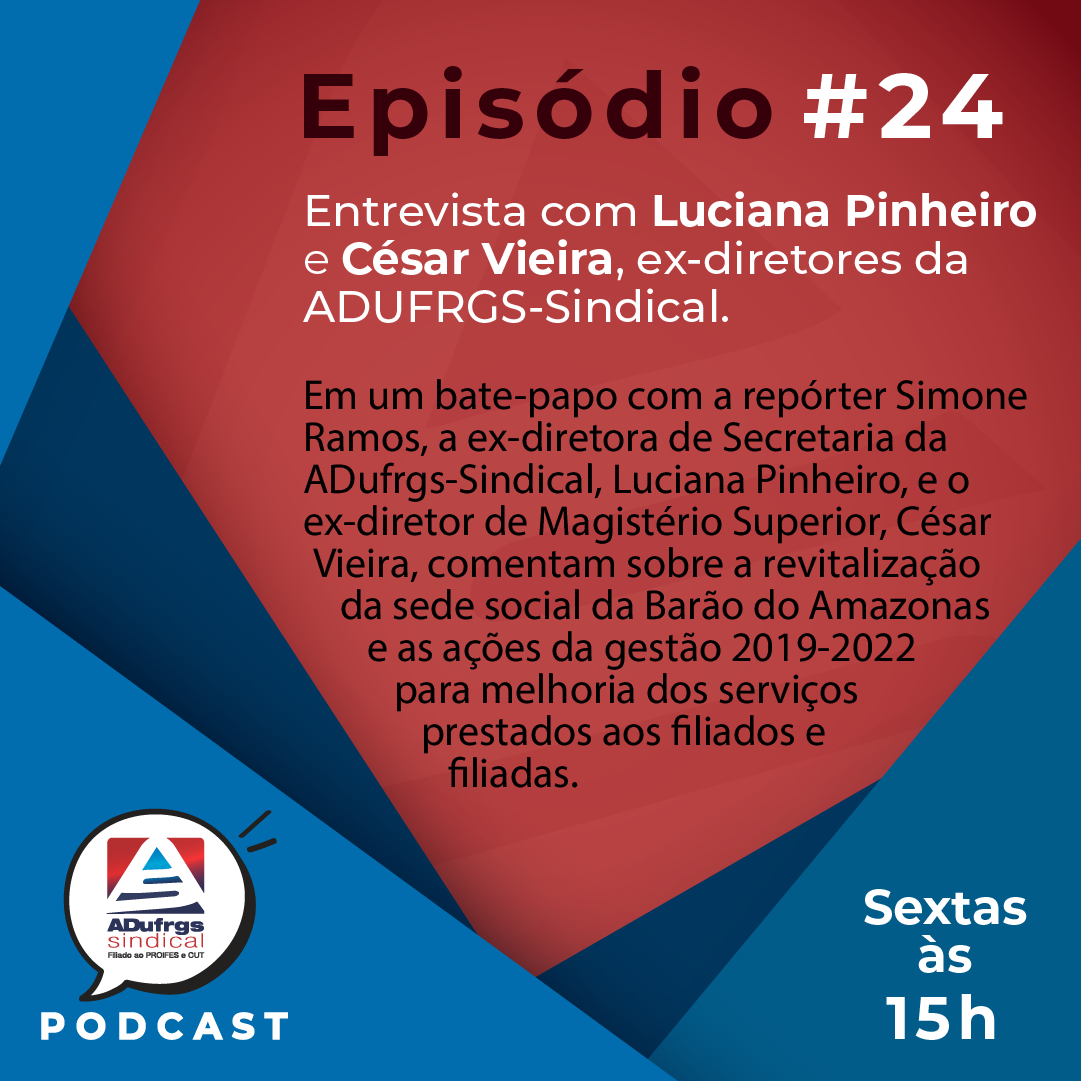 Nesta edição do podcast da ADUFRGS-Sindical, você acompanha um bate-papo com a ex-diretora de Secretaria da ADufrgs-Sindical, Luciana Pinheiro, e o ex-diretor de Magistério Superior, César Vieira, sobre a revitalização da sede social da Barão do Amazonas e as ações da gestão 2019-2022 para melhoria dos serviços prestados aos filiados e filiadas.