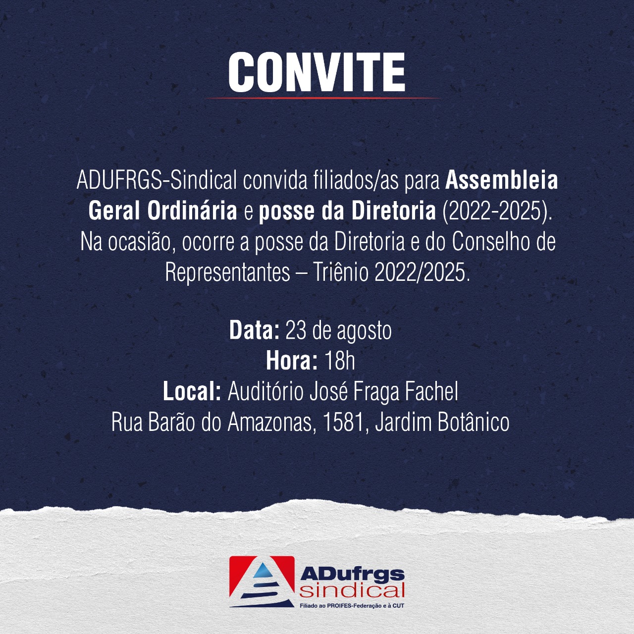 - ADUFRGS-Sindical convoca filiados/as para Assembleia Geral Ordinária e posse da Diretoria (2022-2025) no dia 23 de agosto