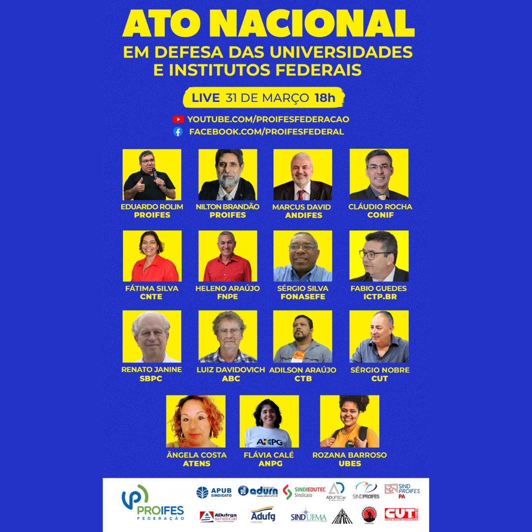 No dia 31 de março, a partir das 18h, a ADUFRGS-Sindical retransmite pelo seu canal no Facebook live com presidentes e/ou representantes de entidades da educação, como parte da programação do Ato Nacional em Defesa das Universidades Pública e dos Institutos Federais.
