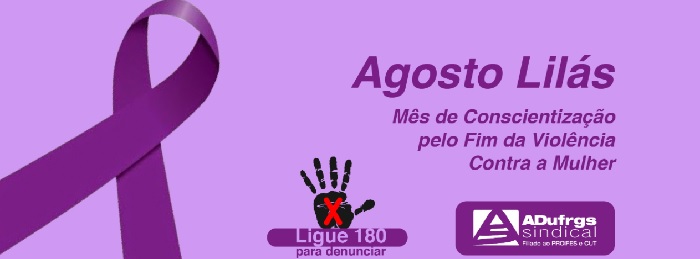 ADUFRGS-Sindical entra na campanha Agosto Lilás, que marca o Mês de Conscientização pelo Fim da Violência Contra a Mulher. A ADUFRGS-Sindical entrou na campanha Agosto Lilás para chamar a atenção para a violência doméstica. A iniciativa visa não só alertar a sociedade para o enfrentamento a este tipo de violência como também divulgar formas de ajuda, entre elas, o telefone Ligue 180, que também serve como canal de denúncia.
