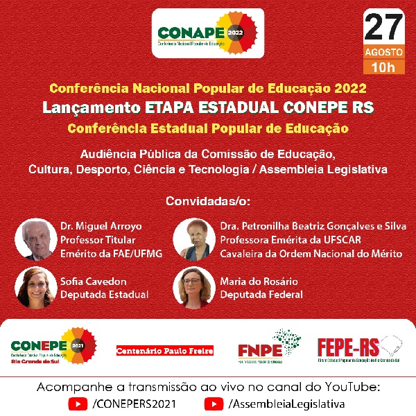 Nesta sexta, 27, às 10h, acontece o lançamento da Conferência Estadual Popular de Educação (CONEPE) 2021, durante Audiência Pública da Comissão de Educação, Cultura, Desporto, Ciência e Tecnologia da Assembleia Legislativa do Rio Grande do Sul. A atividade representa a etapa no Estado da Conferência Nacional Popular de Educação (CONAPE 2022).