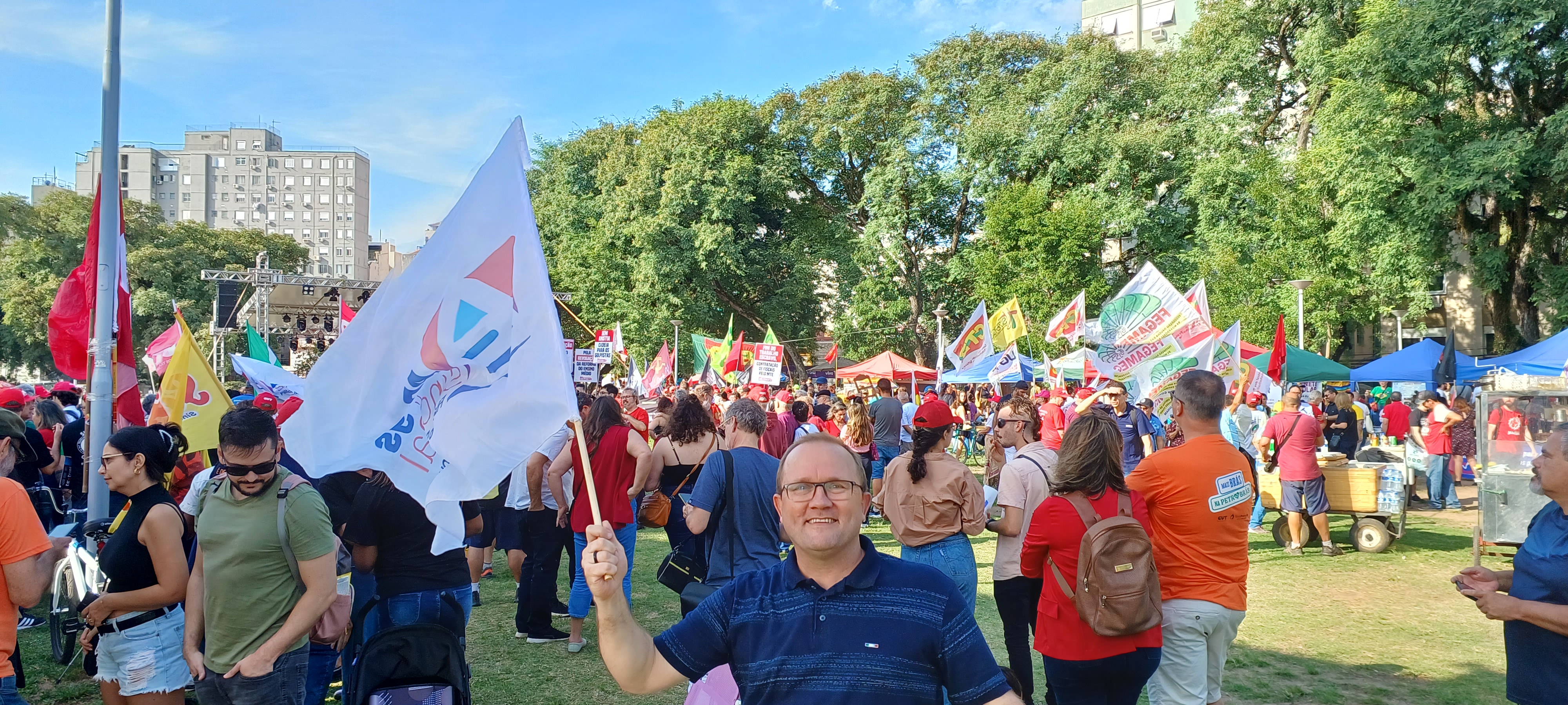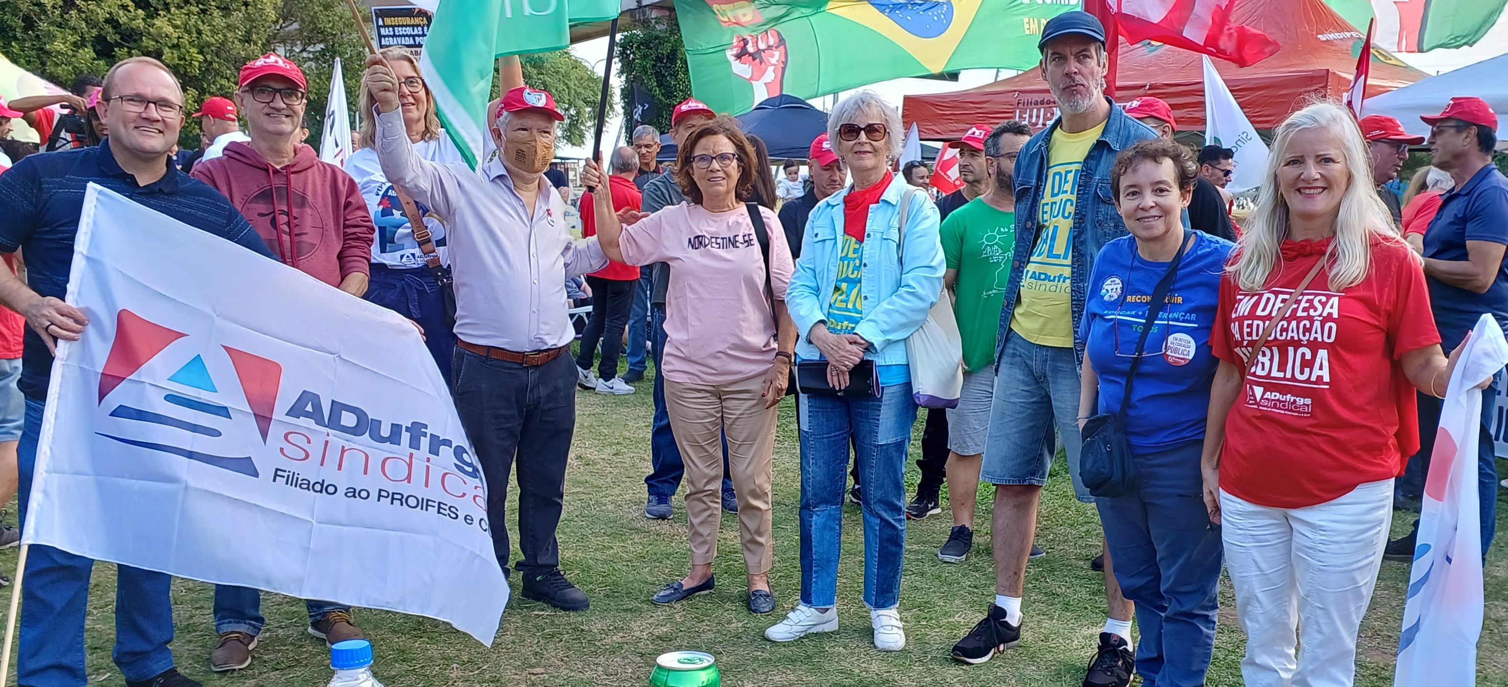 Professores e professoras filiadas da ADUFRGS-Sindical fortaleceram a luta em defesa da educação pública e por melhores condições de trabalho, durante ato unificado da CUT e demais centrais sindicais, na segunda-feira, 1° de maio, na Praça da Júlio Mesquita, na Usina do Gasômetro.