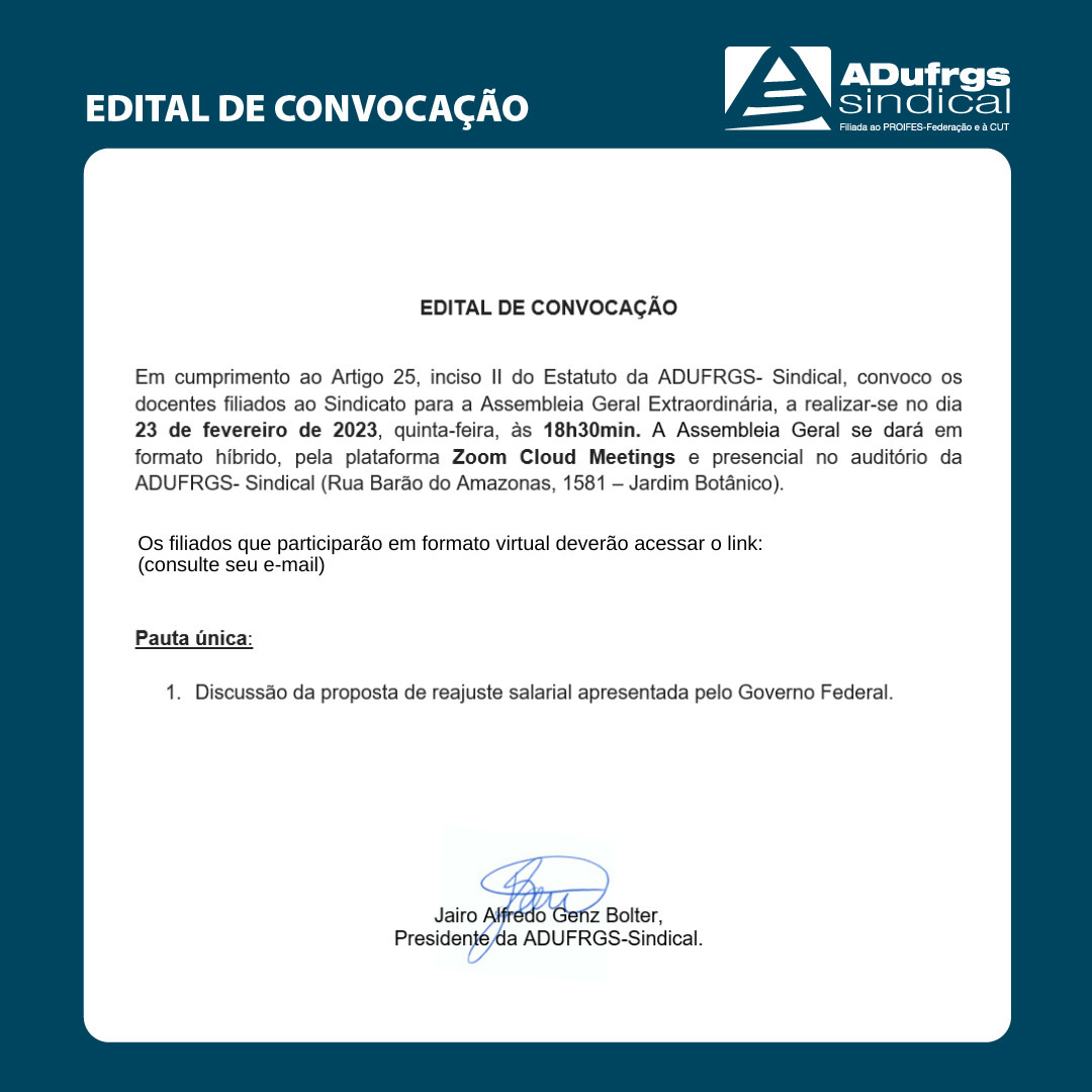 Na próxima quinta-feira, 23, às 18h30, a ADUFRGS-Sindical realiza Assembleia Geral Extraordinária em formato híbrido, pela plataforma Zoom Cloud Meetings e presencial no auditório da ADUFRGS- Sindical (Rua Barão do Amazonas, 1581 – Jardim Botânico). A pauta única será a discussão da proposta de reajuste salarial apresentada pelo Governo Federal.