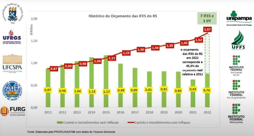 Levando em conta apenas as sete universidades federais gaúchas, o que inclui a Universidade Federal da Fronteira Sul, que tem campi em outros estados, e os três institutos federais, as instituições dispuseram, somadas, de R$ 0,87 bilhões para custeio e investimentos em 2011, o que seria equivalente a R$ 1,67 bilhões em valores corrigidos. Contudo, para 2022, a previsão orçamentária para a área é de apenas R$ 0,76 bilhão, o que também corresponde a 45% dos valores corrigidos de 2011.