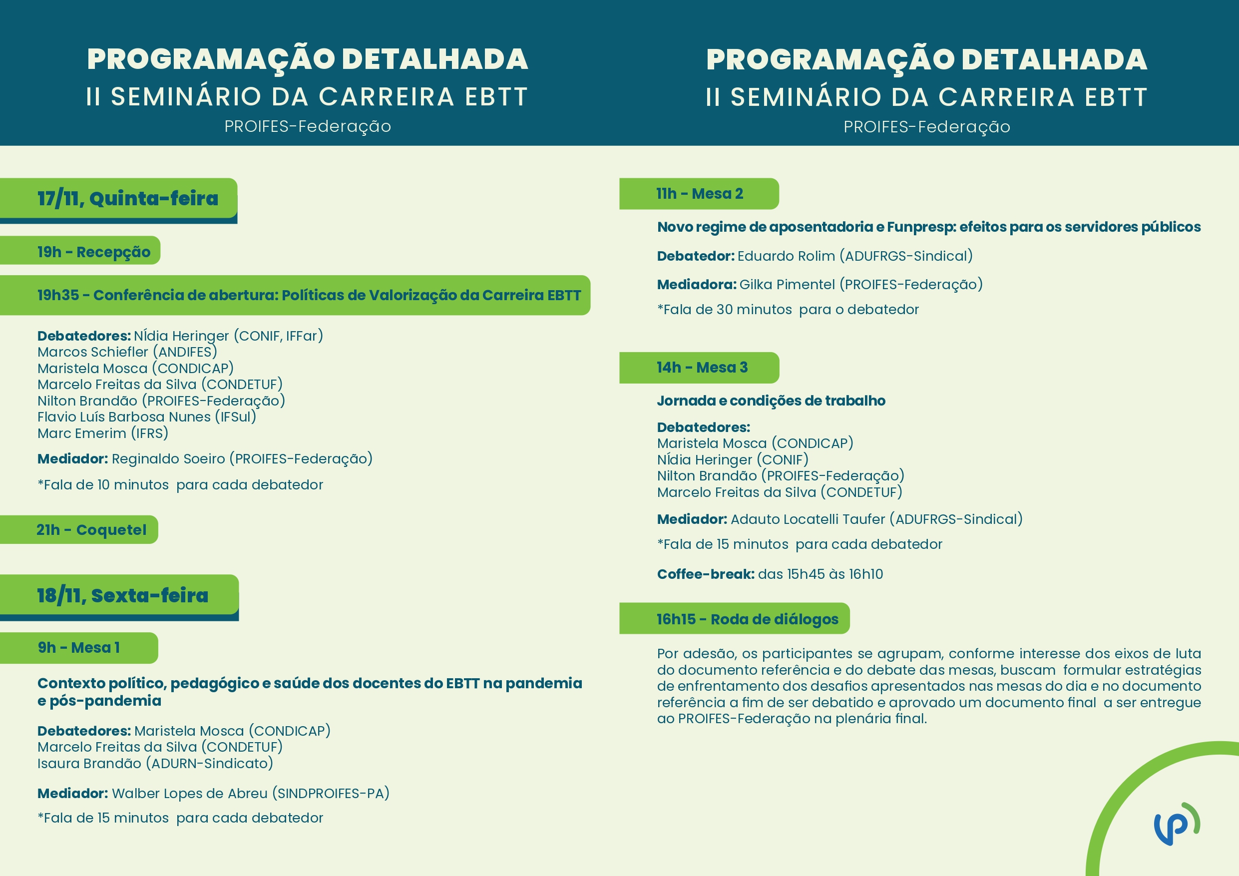 Serão cinco mesas de debates, além de roda de diálogos e conferências de abertura e de encerramento, o encontro abordará temas como: Políticas de Valorização da Carreira EBTT; Contexto político, pedagógico e saúde dos docentes do EBTT na pandemia; Novo regime de aposentadoria e Funpresp: efeitos para os servidores públicos; Jornada e condições de trabalho (Ponto eletrônico, gestão do tempos e locais de exercício docente, portaria 983, IN2 do ME); Valorização profissional (Manter a isonomia salarial com MS; decreto 1590; RSC; usufruto de licenças, incentivos à qualificação); A carreira do EBTT e os desafios da educação.