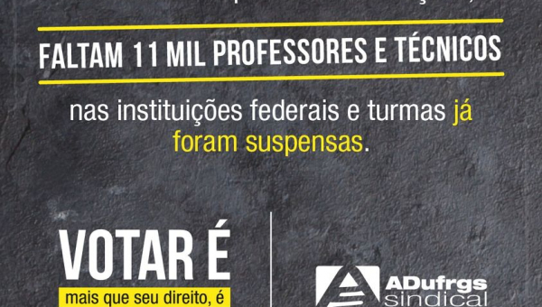 As eleições de 2022 estão próximas e chega a hora de brasileiros e brasileiras lutarem pela manutenção dos direitos sociais estabelecidos na Constituição Federal de 1988. É dever do Estado garantir investimento público para saúde e educação. Por conta disso, a ADUFRGS-Sindical lança uma campanha pelo voto em defesa da ciência e da educação pública, gratuita, inclusiva, laica de qualidade social. Todos precisam votar em outubro! Não podemos nos abster, temos de ir às urnas. O País e as nossas instituições de ensino precisam de nós. Vamos trabalhar para eleger candidatos que valorizam a educação pública e a ciência.